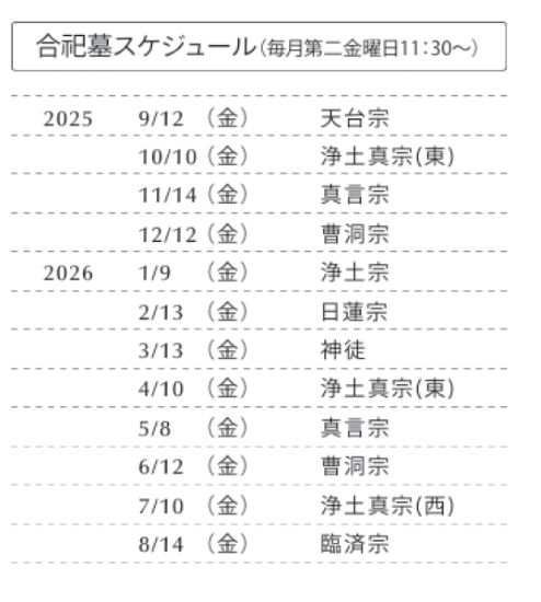 青葉園では、引き継ぐ方がいなくなったお墓を対象に合祀墓を用意しています。毎月第二金曜日の11時30分より合祀墓にて合同供養祭を実施しています。詳しいお問い合わせは青葉園管理事務所(TEL:048-623-2111)へお願いします。様々な宗派の方が納骨されているため、月毎に異なる宗派の寺院に読経して頂きます。